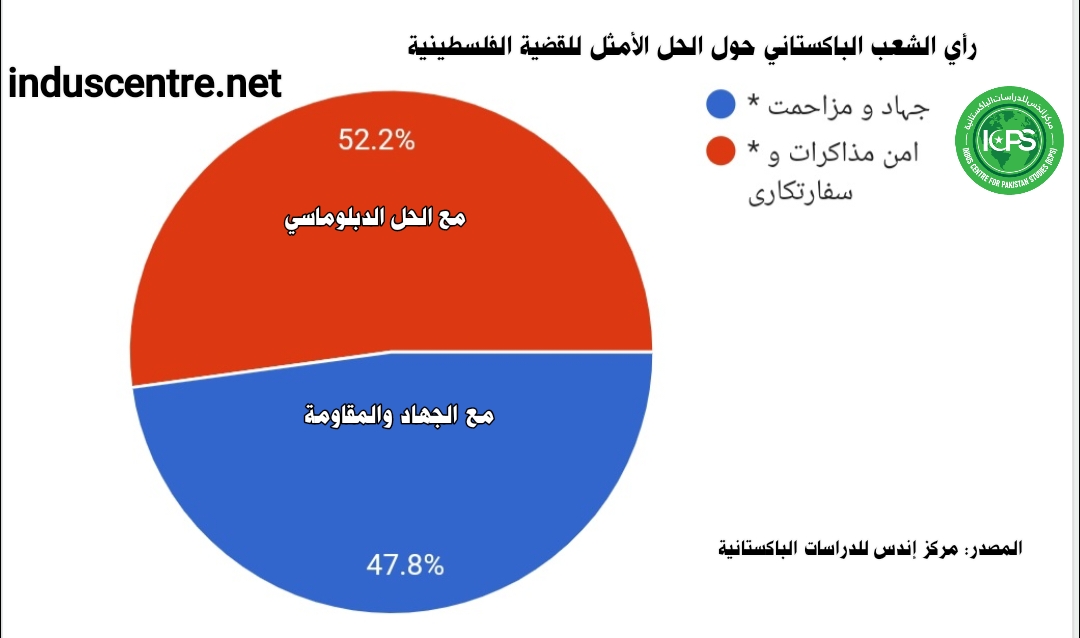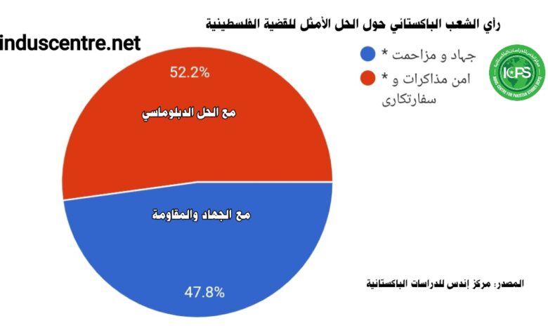 أظهر استطلاع حديث لمركز إندس للدراسات الباكستانية انقسام الشارع الباكستاني حول الحل الأمثل للقضية الفلسطينية، حيث أكد 52.2% من الباكستانيين أن المفاوضات والدبلوماسية هي الخيار الأمثل، في حين يرى 47.8% أن الجهاد والمقاومة هما الطريق الأنسب.وشمل الاستطلاع، الذي أجري عبر استبيان جوجل الشرائح المختلفة، وتجاوز عدد المشاركين في الاستطلاع 23 ألف مشارك من خلفيات اجتماعية متنوعة داخل باكستان وخارجها، أغلبهم من حاملي الشهادات العليا، ومن الفئة العمرية فوق 35 سنة، وبخاصة التجار والمستثمرين.وقالت منسقة المركز، شمائلة أكرم، إن الاستبيان تناول قضايا جوهرية مثل موقف الباكستانيين من تطبيع العلاقات مع إسرائيل، وموقفهم من الهجوم الذي شنته حماس على إسرائيل في أكتوبر، والدول الأكثر دعمًا للقضيةالفلسطينية، إضافة إلى موقفهم من المبادرة السعودية لحل الدولتين، والعوائق الأساسية أمام الحل.وأوضحت شمائلة أن الفارق الضئيل بين مؤيدي الحوار الدبلوماسي ومؤيدي المقاومة يعكس تأثير الاعتداءات الإسرائيلية المستمرة والدعم الأمريكي لها، ما يجعل البعض يرون أن لغة المفاوضات صعبة الإقناع مع إسرائيل؛ التي اعتادت على العمليات العسكرية ضد الفلسطينيين، خصوصًا ضد الأطفال والنساء. وأكدت منسقة مركز إندس أن الاستطلاع تم وفق سياسة حيادية وآليات شاملة في اختيار المشاركين، حيث شمل الاستبيان الفئات النشطة وغير النشطة في السياسة والإعلام على حد سواء. وتم توزيع الاستبيان على المواطنين في المدن الكبرى والقرى والمناطق النائية، بما في ذلك بلوشستان، جلجت بلتستان، سوات، وسكهار، ورحيم يارخان. كما استهدف الاستطلاع شرائح متنوعة من حيث المذاهب، بما في ذلك الشيعة، الديوبندية، البريلوية، أهل الحديث، القادرية والجشتية، لضمان تمثيل دقيق لمواقف المجتمع الباكستاني المختلفة.وأضافت شمائلة أن نتائج الأجزاء الأخرى من الاستطلاع سيتم نشرها قريبًا، بعد إتمام تحليل البيانات بشكل كامل.